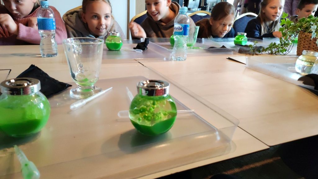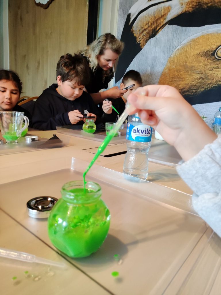 Į indelį įpylėme vandens, aliejaus ir su pipete įlašinome guašo, lašindami galvojome apie neigiamas emocijas, kurios kažkada mus buvo aplankę… susidarė daug burbuliukų. Tada įdėjome vitamino C ir greit užsukome indelį. Turinys/„emocijos“ pradėjo burbuliuoti ir kai kurių net prasiveržė pro dangtelį.