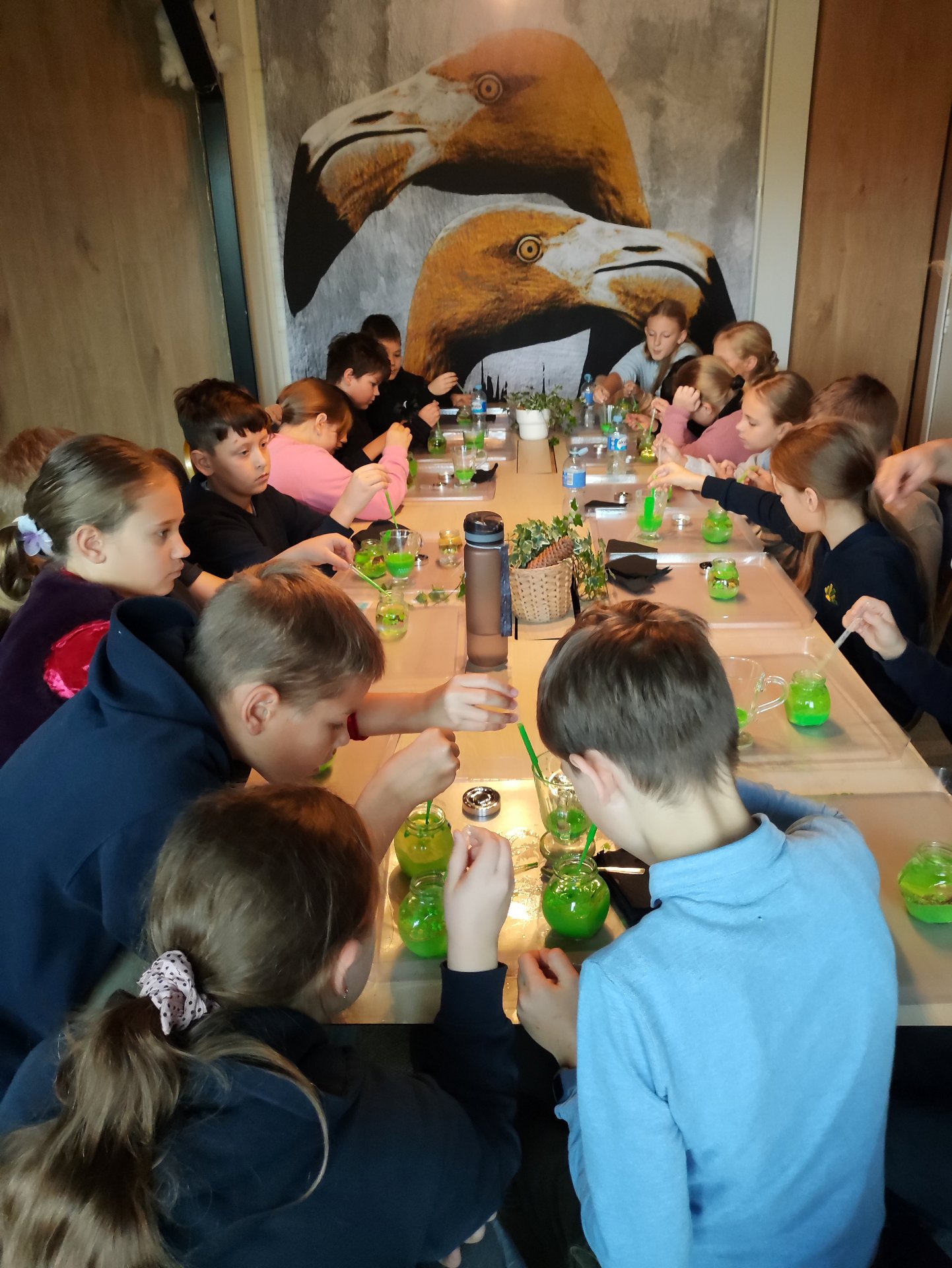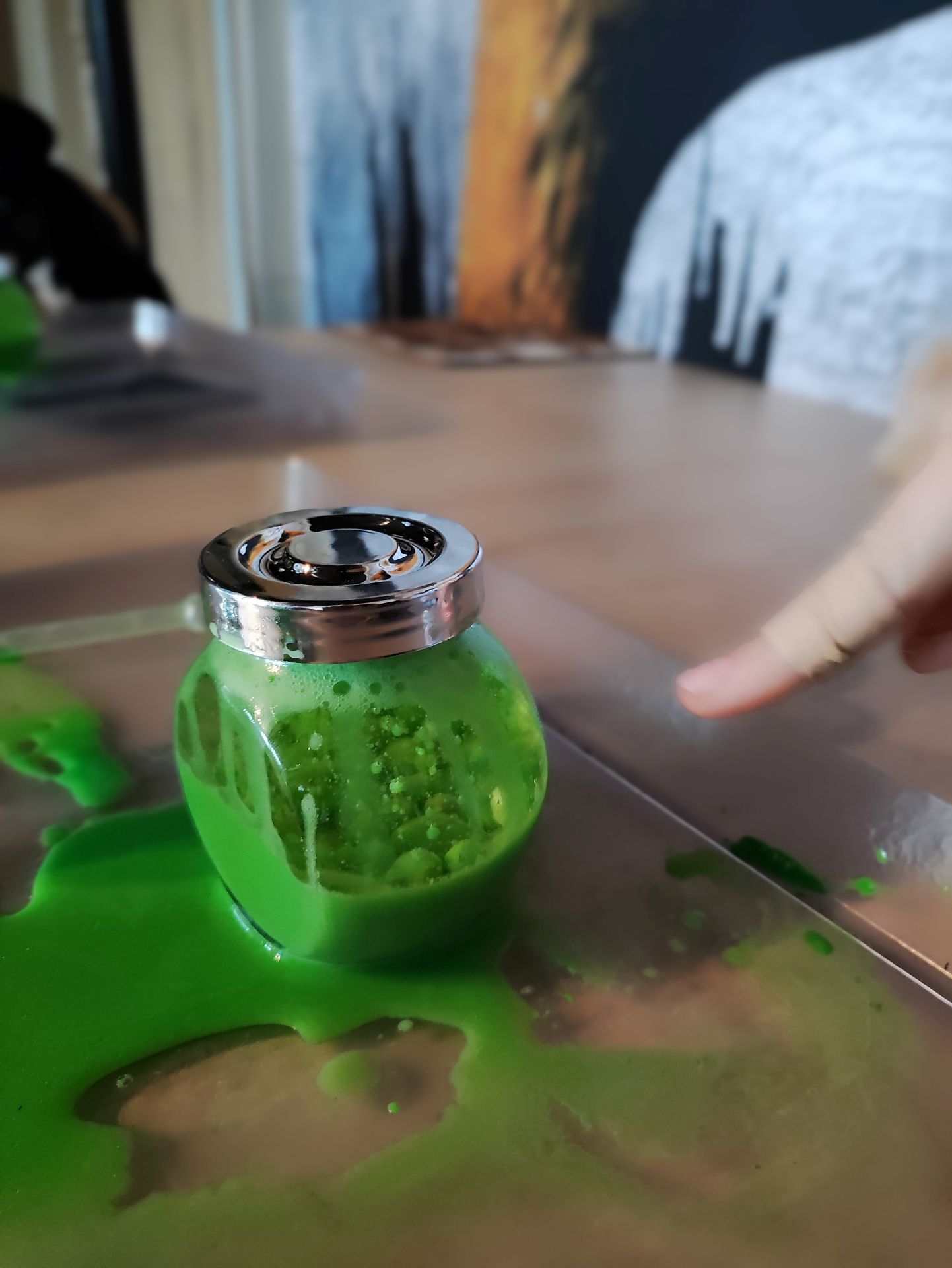 Į indelį įpylėme vandens, aliejaus ir su pipete įlašinome guašo, lašindami galvojome apie neigiamas emocijas, kurios kažkada mus buvo aplankę… susidarė daug burbuliukų. Tada įdėjome vitamino C ir greit užsukome indelį. Turinys/„emocijos“ pradėjo burbuliuoti ir kai kurių net prasiveržė pro dangtelį.