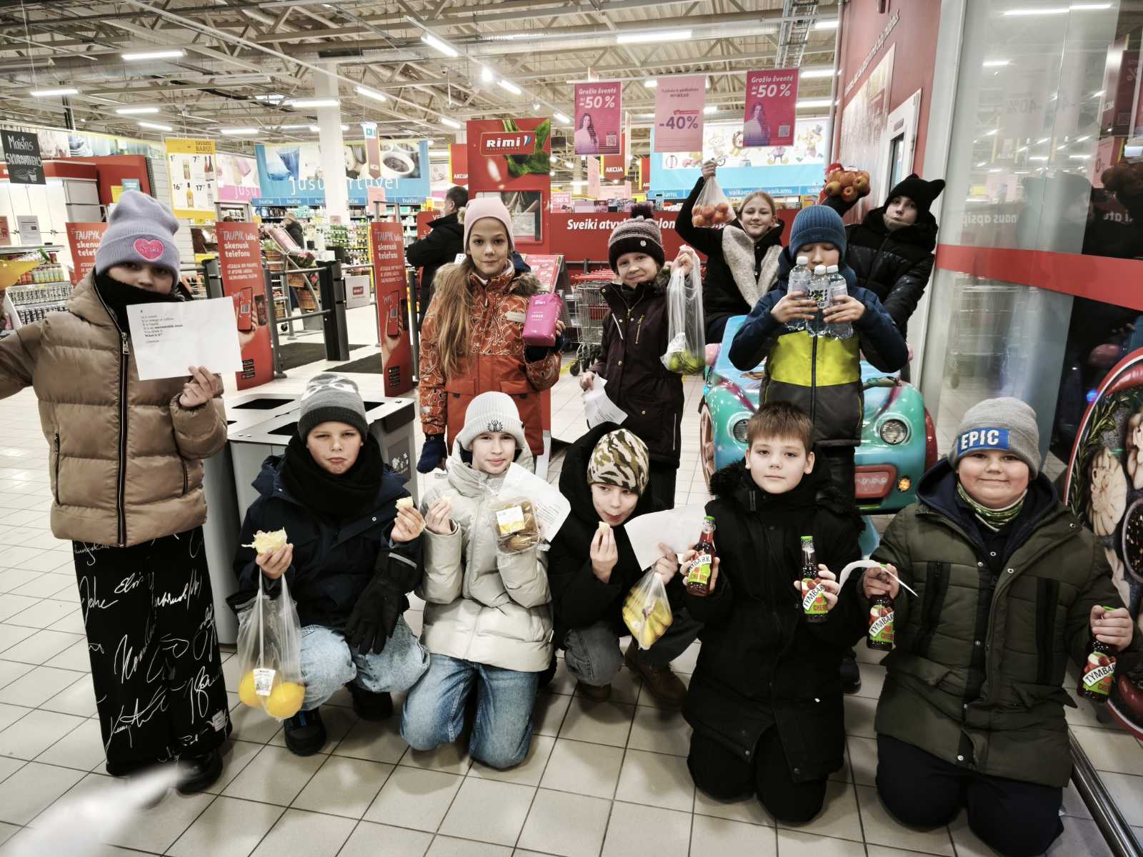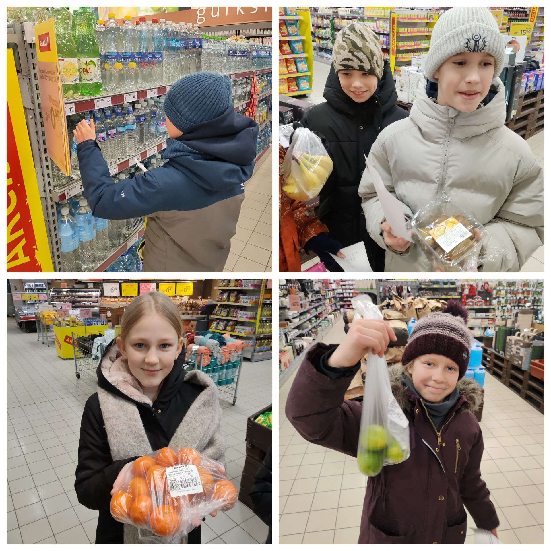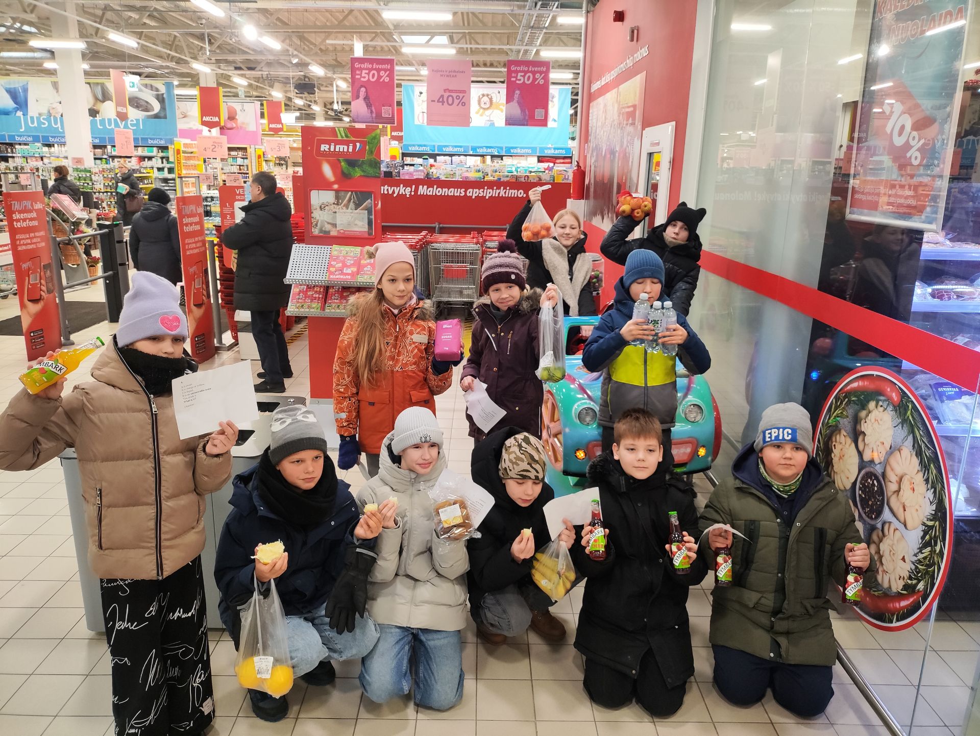 4B klasės mokiniai, kartu su anglų kalbos mokytoja Jolanta ir klasės mokytoja Edita keliavo iki artimiausios parduotuvės. Vyko integruotos anglų kalbos ir matematikos pamokos. Anglų kalbos mokytoja kiekvienam mokiniui išdalino angliškas mįsles. Jas mokiniai turėjo įminti, parduotuvėje surasti tą daiktą ir jį nusipirkti (arba nusifotografuoti), bet pirkti buvo žymiai įdomiau. Pirkinys turėjo kainuoti iki 2 eurų. Mokiniai mokėsi pasverti kai kurias prekes, apskaičiuoti, kiek pirkinys, kainuos, kai žino prekės kilogramo kainą. Mokiniai parduotuvėje pirkdama lygino kainas, stebėjo, kuri kainuoja pigiau, kuri brangesnė.