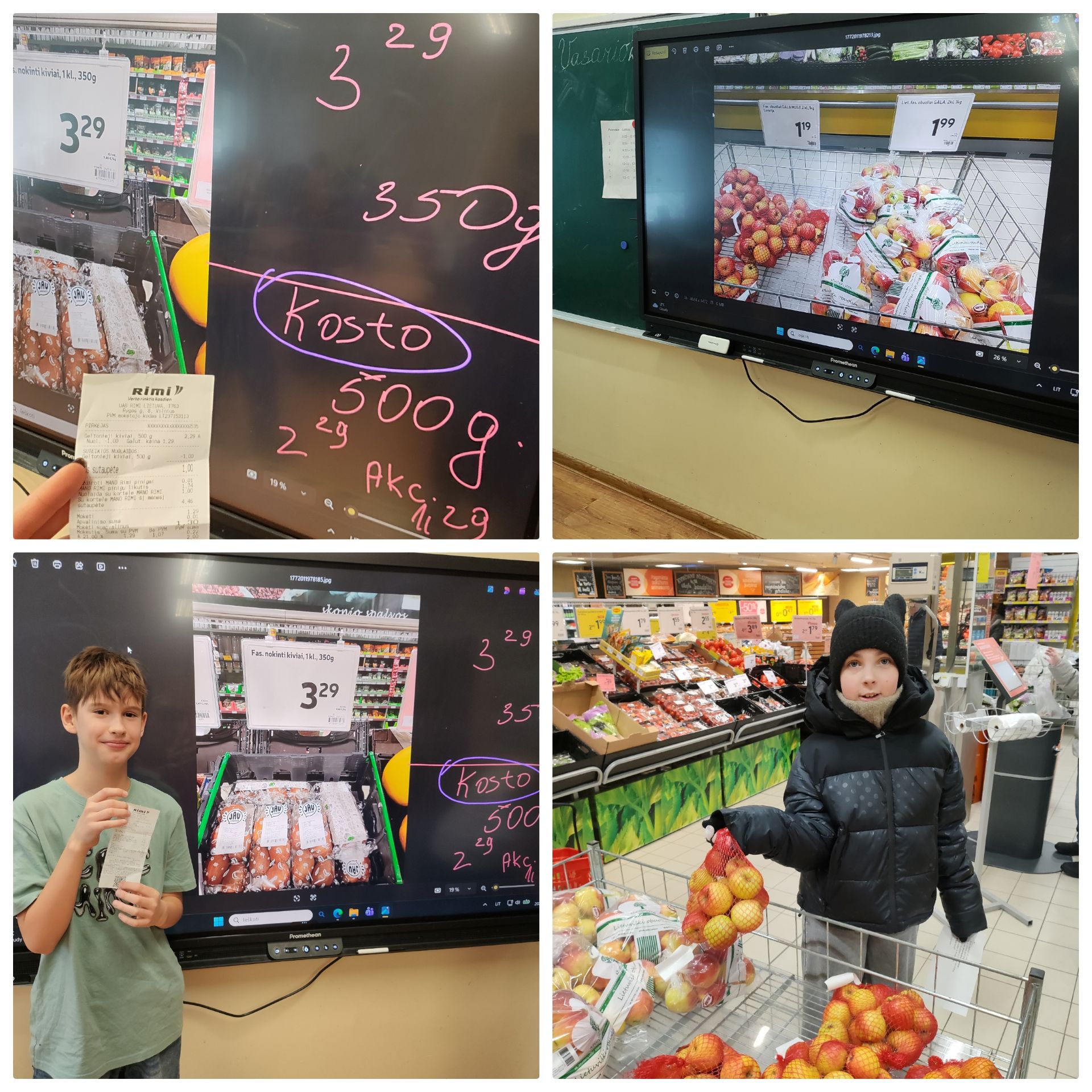 Grįžę į klasę, per matematikos pamoką, palyginome prekių kainas. Analizavome prekių čekius ir parduotuvėje panašių prekių kainas. Aptarėme, kuri prekė iš dviejų panašių pirkti labiau apsimoka.