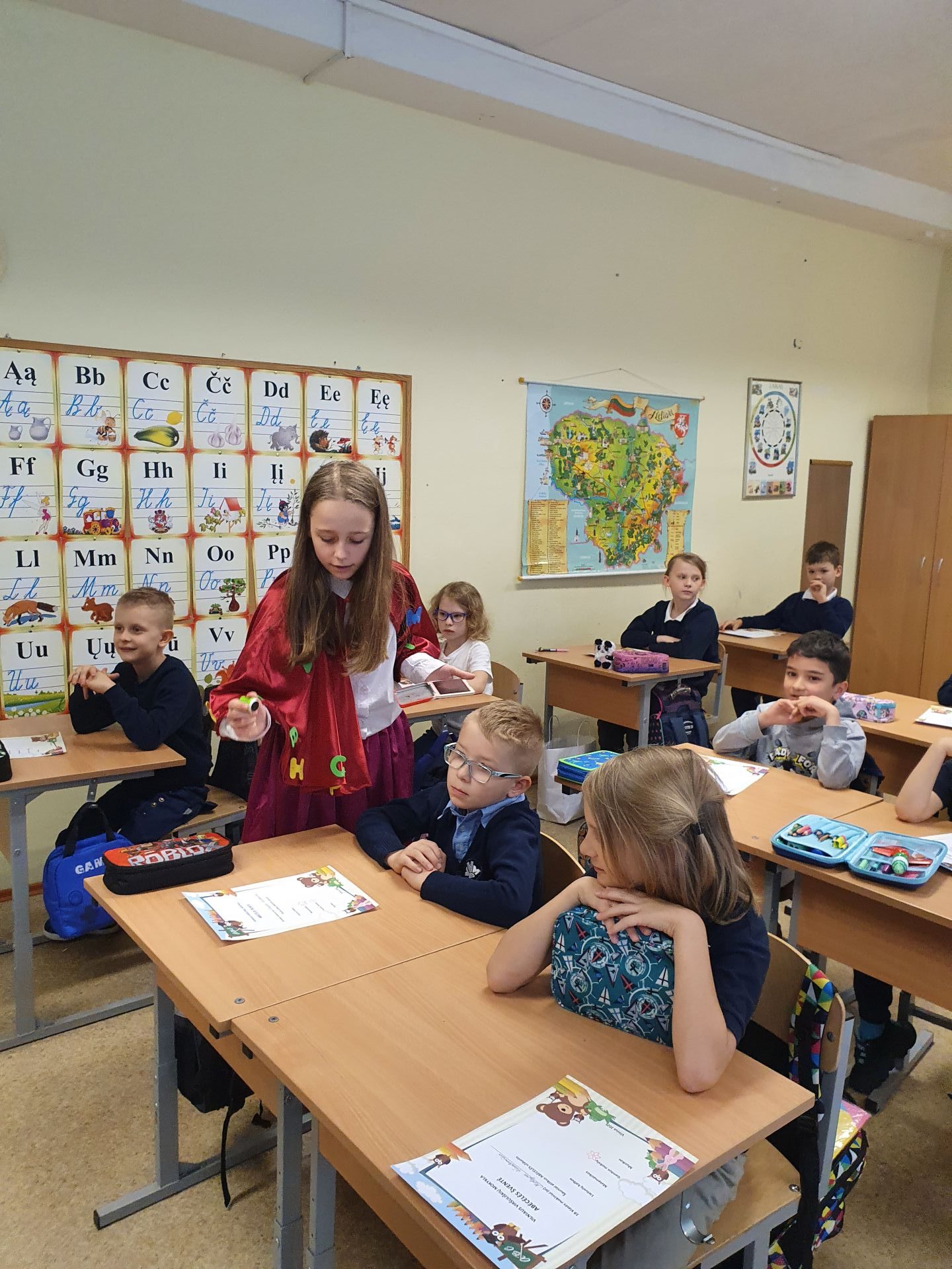 Gegužės 15 d. Abėcėlės šventė smagiai vyko 1B klasėje. Laukdami staigmenos, pirmokai kartojo abėcėlę. Vyriausi progimnazijos pradinukai, 4A klasės mokiniai, pateikė pirmokams daug užduočių. Patikrinę 1B klasės mokinių matematikos, pasaulio pažinimo, lietuvių kalbos, muzikos žinias, kiekvienam įteikė pirmoko pažymėjimą, padovanojo savo pagamintas dovanėles, palinkėjo didelės sėkmės klaidžiuose mokslo labirintuose. Nuoširdus jiems ačiū!