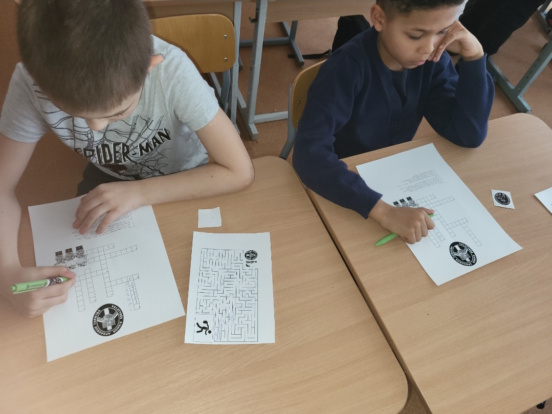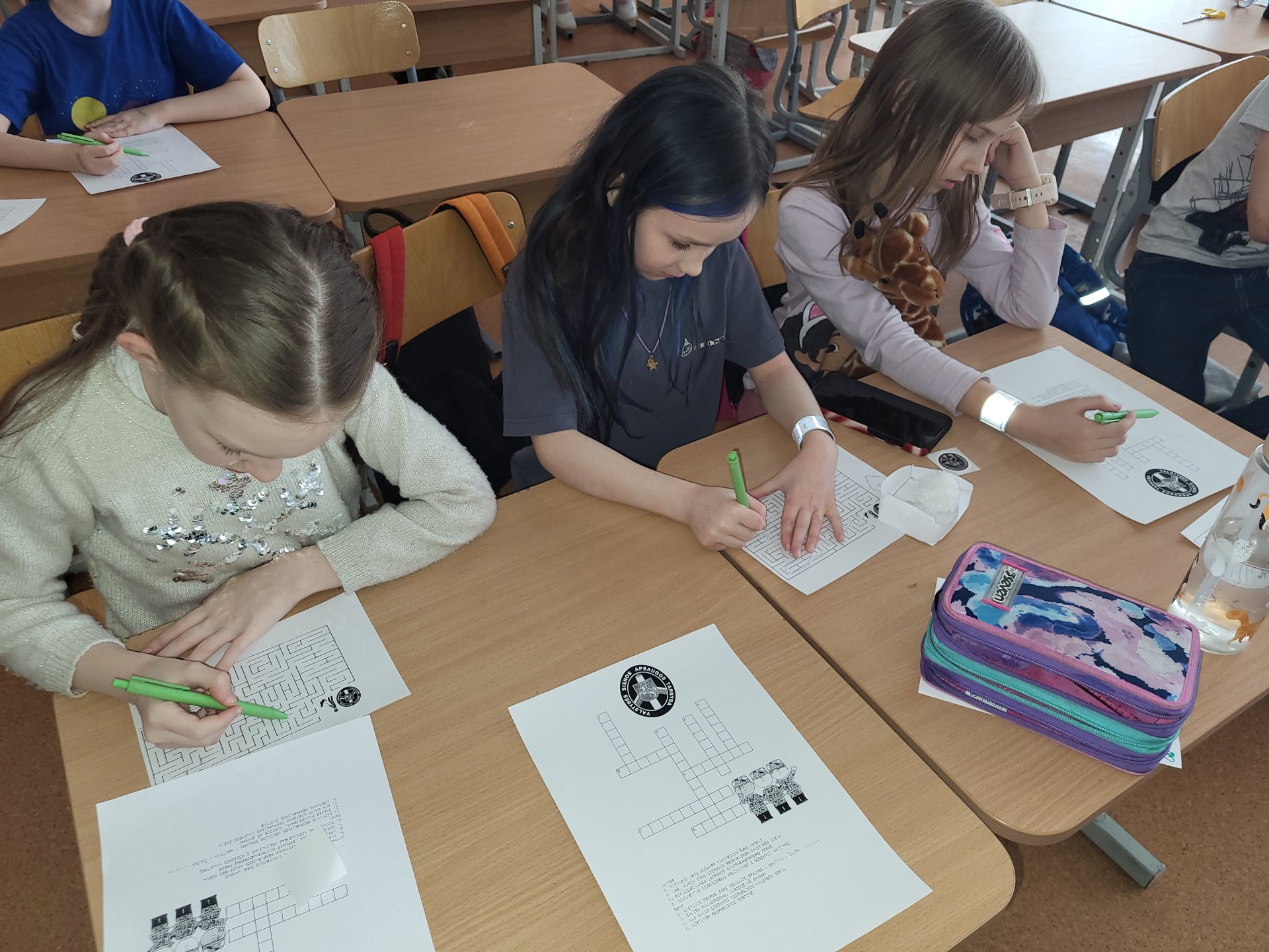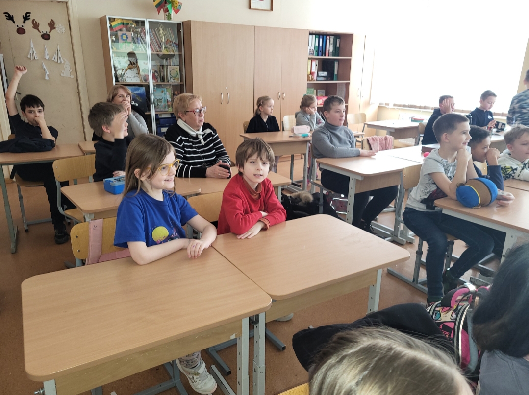 Mokiniai noriai atsakinėjo į pareigūnės pateiktus klausimus, domėjosi atsinešta atributika, susikaupę sprendė kryžiažodžius. Ačiū, Margarita.