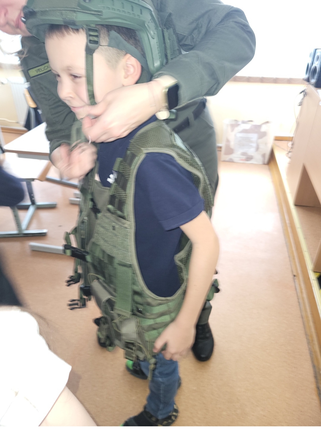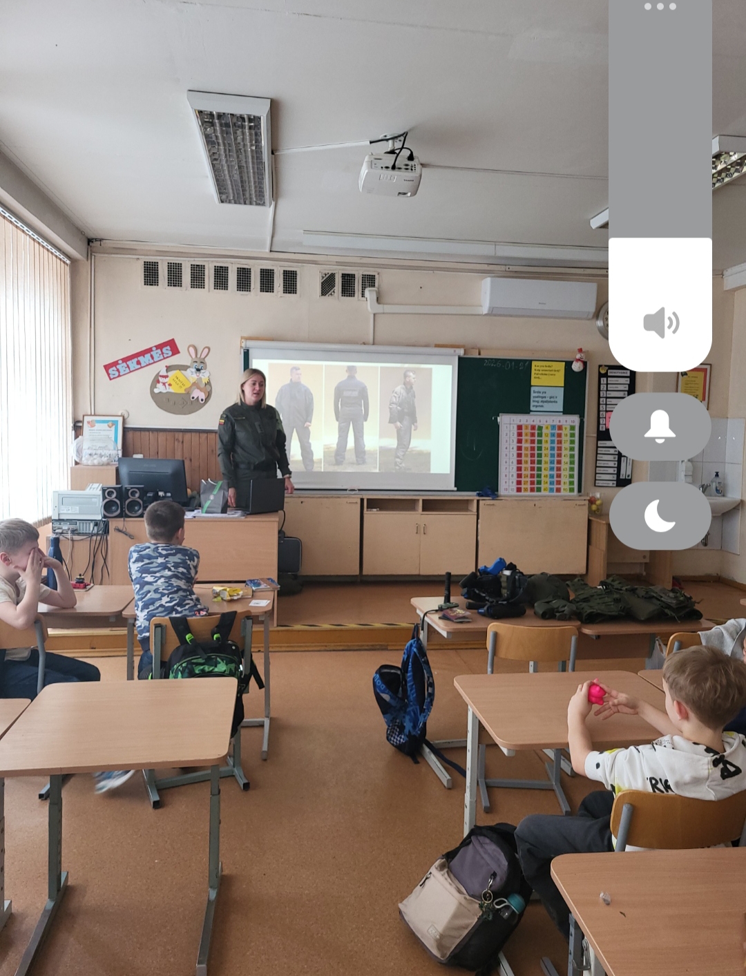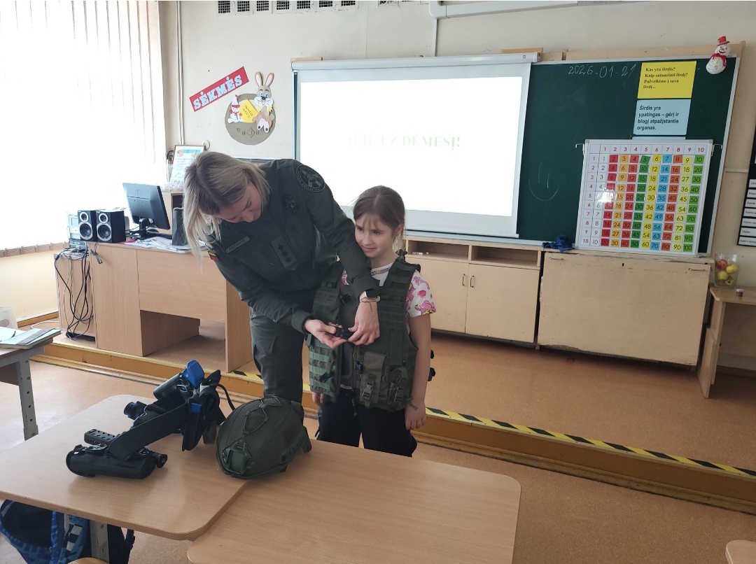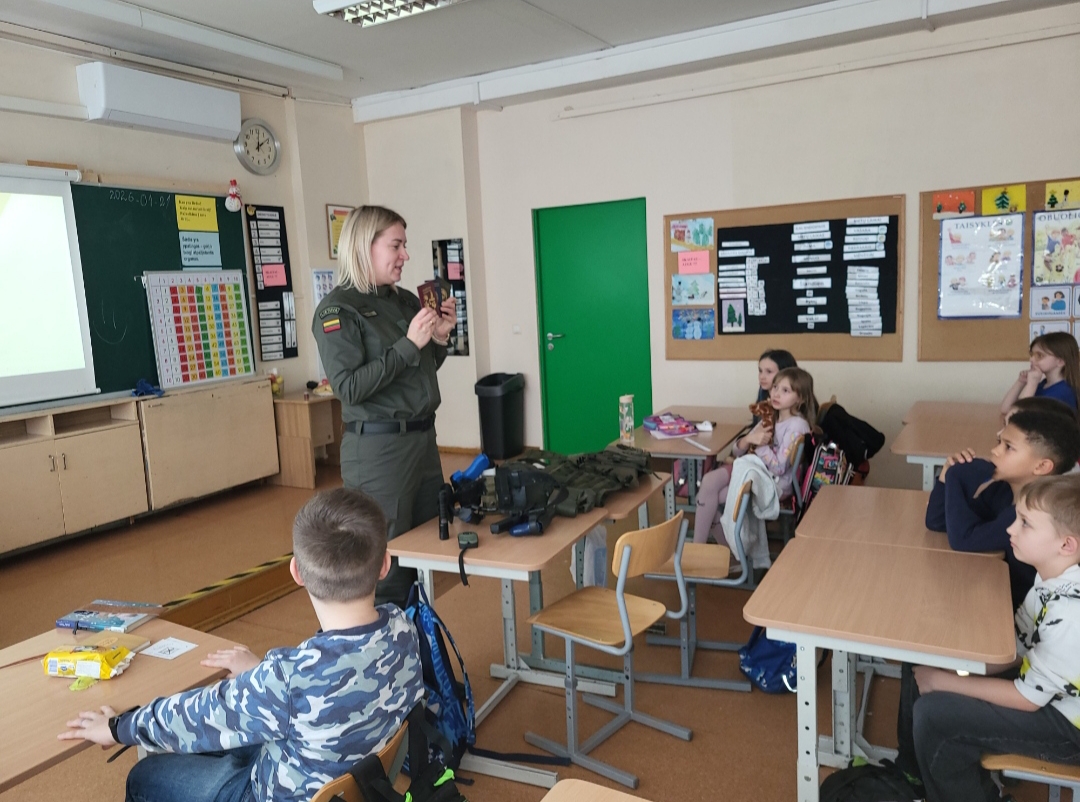 Sausio 23 dieną 2A, 2E klasių mokiniai dalyvavo susitikime su Pasieniečių mokyklos pareigūne Margarita Veličkiene, 2A klasės mokinės Elijos mama, kuri pristatė pasieniečių tarnybą – valstybės sienos apsaugą, jai keliamus uždavinius bei būdus juos įgyvendinti, profesijos ypatumus. Supažindino su pasieniečių uniformomis, jų naudojama atributika.