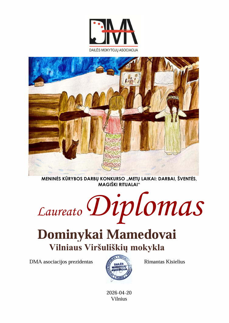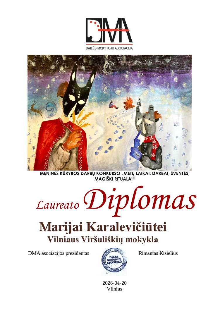 Kasmet dailės mokytojų asociacija organizuoja tradicinį respublikinį piešinių konkursą, skatinantį vaikus ir jaunimą atrasti bei įprasminti senosios baltų kultūros ženklus, užkoduotus mūsų folklore ir tautosakos labirintuose. Šiais metais konkursui atkeliavo 445 kūrybiniai darbai. Vertinimo komisija išrinko geriausius 14-16 metų amžiaus grupės piešinius, tarp kurių apdovanotos laureato diplomais dvi mūsų mokyklos mokinės – Marija Karalevičiūtė (8C kl.) ir Dominika Mamedova (8A kl.). Nuoširdžiai sveikiname!