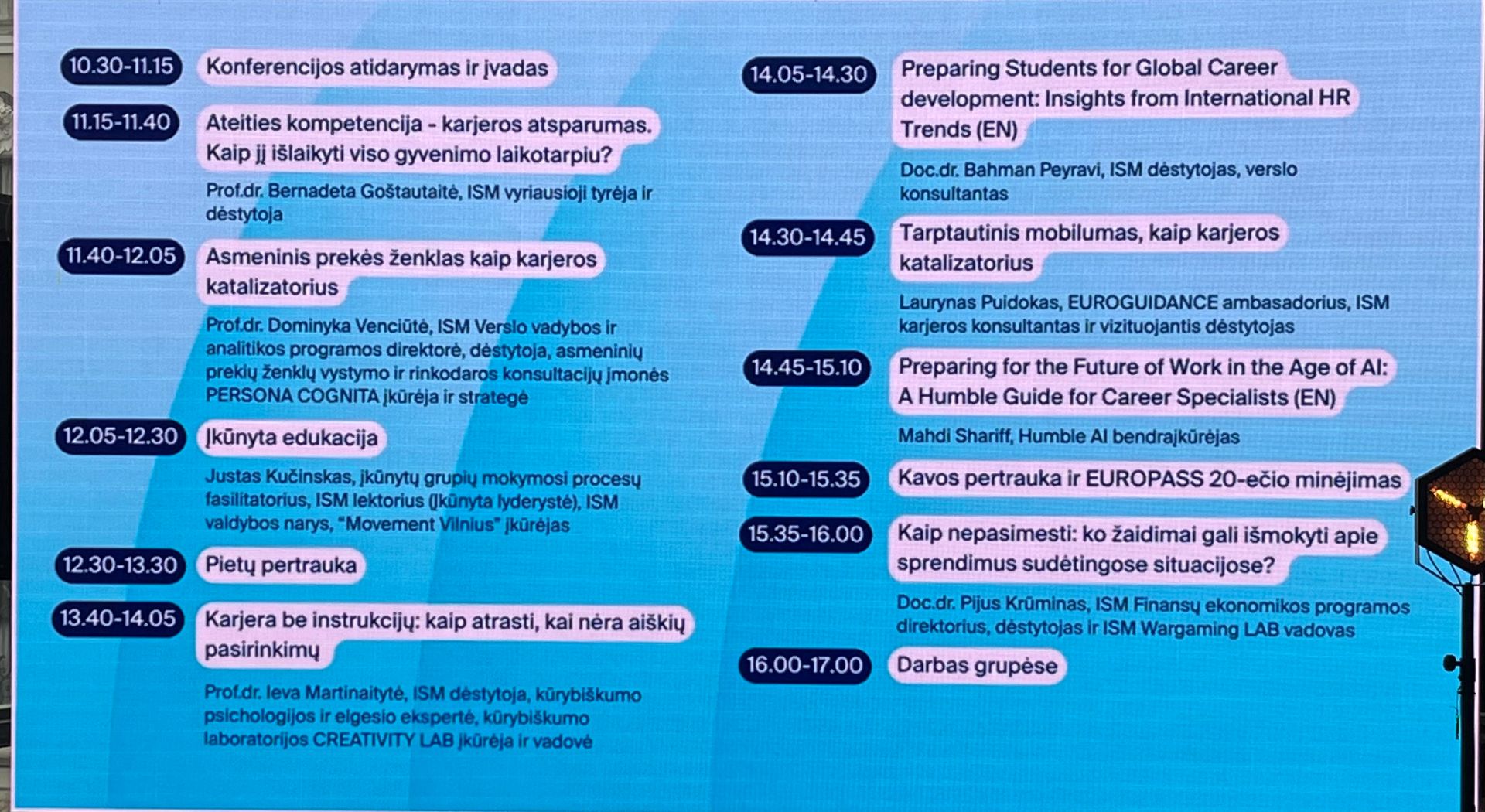 Prof. Dr. Dalius Misiūnas – ISM Vadybos ir ekonomikos universiteto rektorius sakė sveikinimo žodį ir minėjo, kad ISM universitetas stengiasi, kad jauni žmonės būtų pasiruošę gyvenimui ir darbui. Jei darbas yra geras, ir gyvenimas yra geras. Karjeros planavimas – labai svarbus žingsnis. Gyvenime svarbu įsidarbinti. Ir šis procesas bus daromas gyvenime ne vieną kartą. Karjeros sudedamosios dalys: