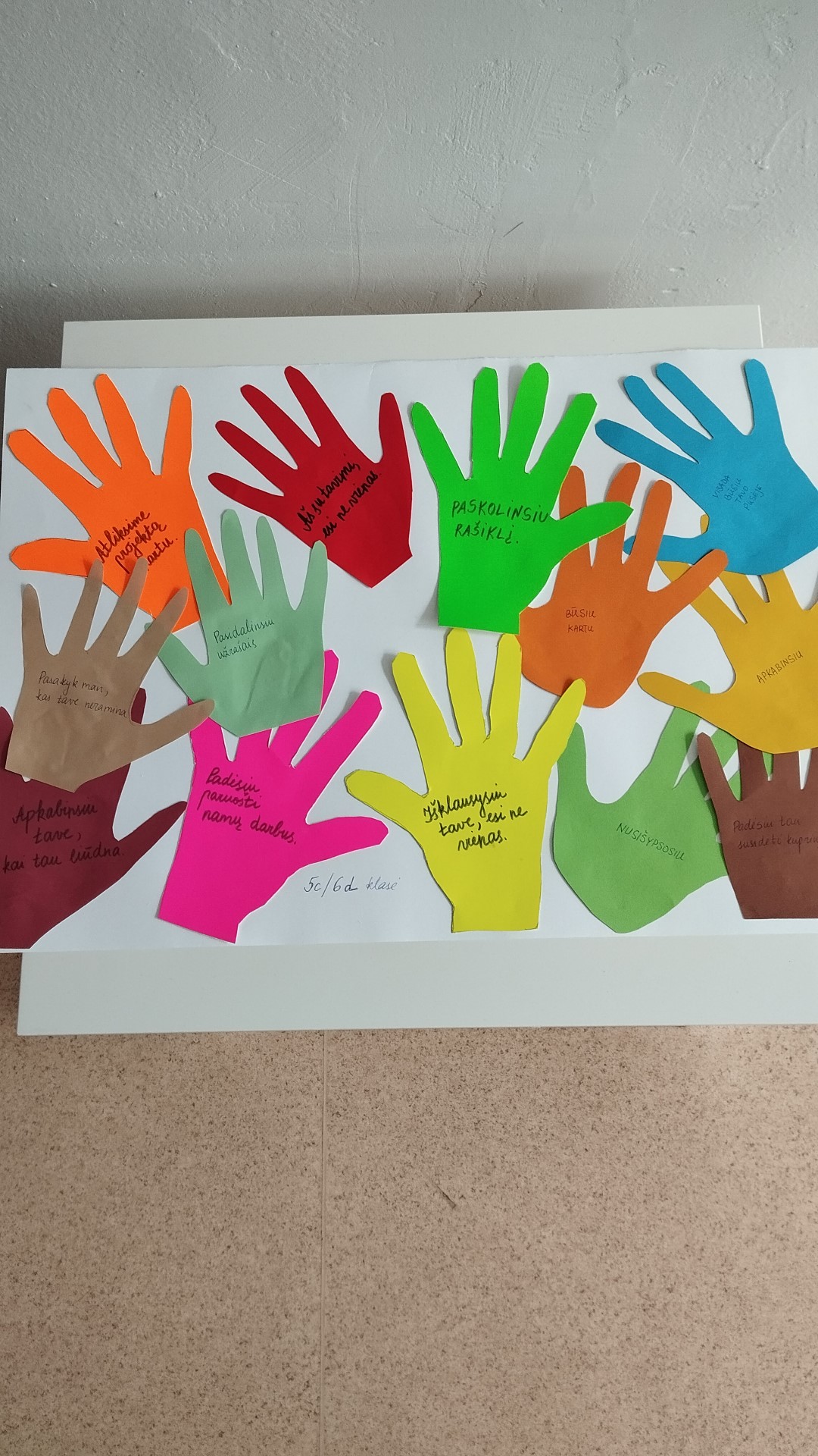 5C/6D klasė dalyvauja parodoje „Vertybės, kurios mus jungia“ ir parengė plakatą „Pagalbos rankos“. Mokiniai iš spalvoto popieriaus iškirpo rankas ir ant jų parašė, kaip gali padėti kitam mokykloje.