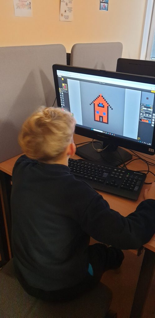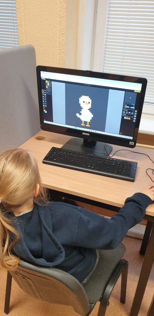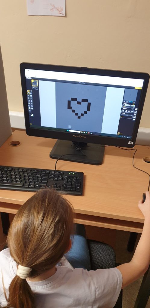 3B klasės mokiniai per informatikos pamoką mokosi kurti atviruką su pikselinės grafikos įrankiu Piskel, kuris leidžia piešiniams atgyti. Jaunesni mokiniai gali kurti vieno kadro atviruką, o vyresni – kelių kadrų animuotą atviruką, kurį vėliau galima išsaugoti GIF formatu.