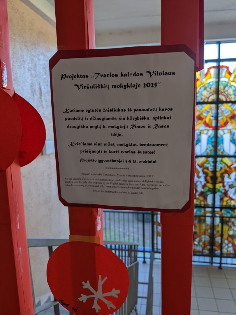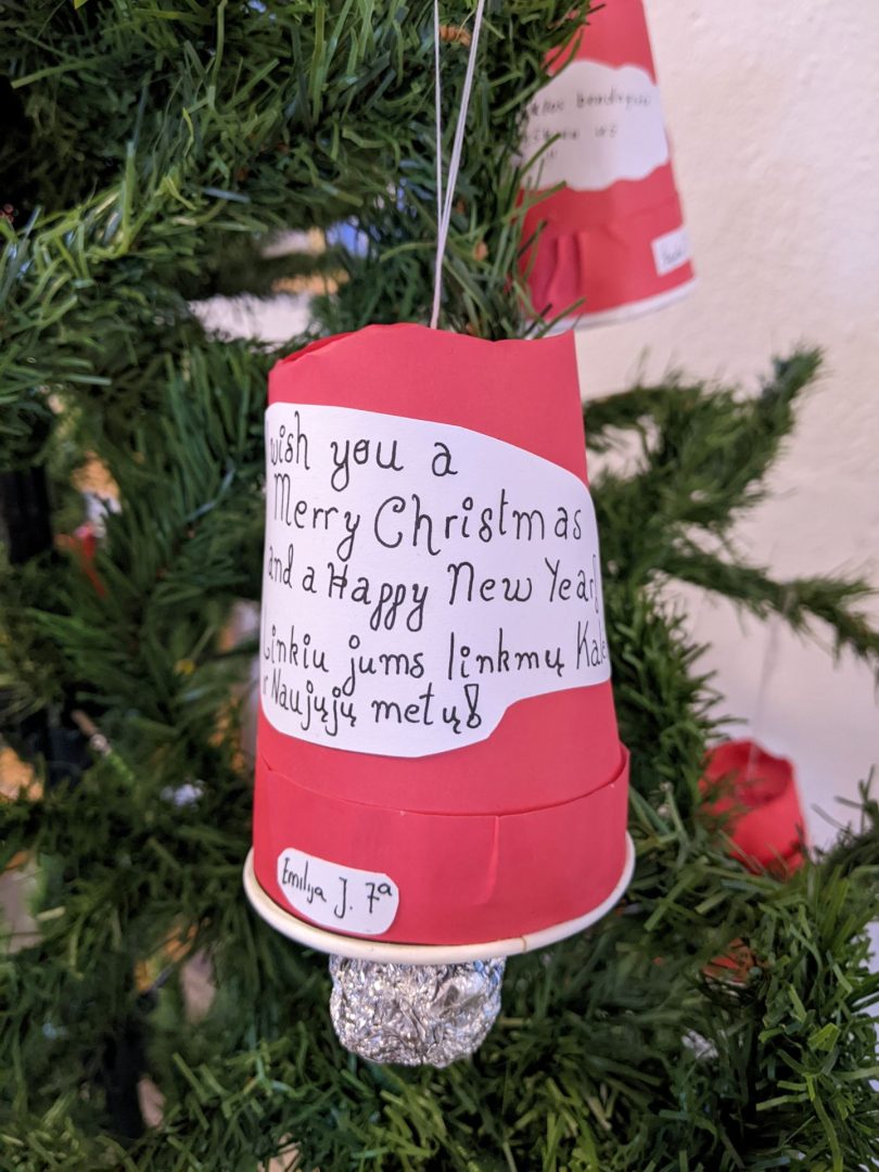 Kuriame eglutės žaisliukus iš panaudotų kavos puodelių, rašome sveikinimus lietuvių ir anglų kalbomis bei džiaugiamės šia kūrybiška, aplinkai draugiška anglų k. mokytojų Rimos G. ir Rasos J.R. idėja. Kviečiame visą mūsų mokyklos bendruomenę prisijungti ir kurti tvarias šventes!