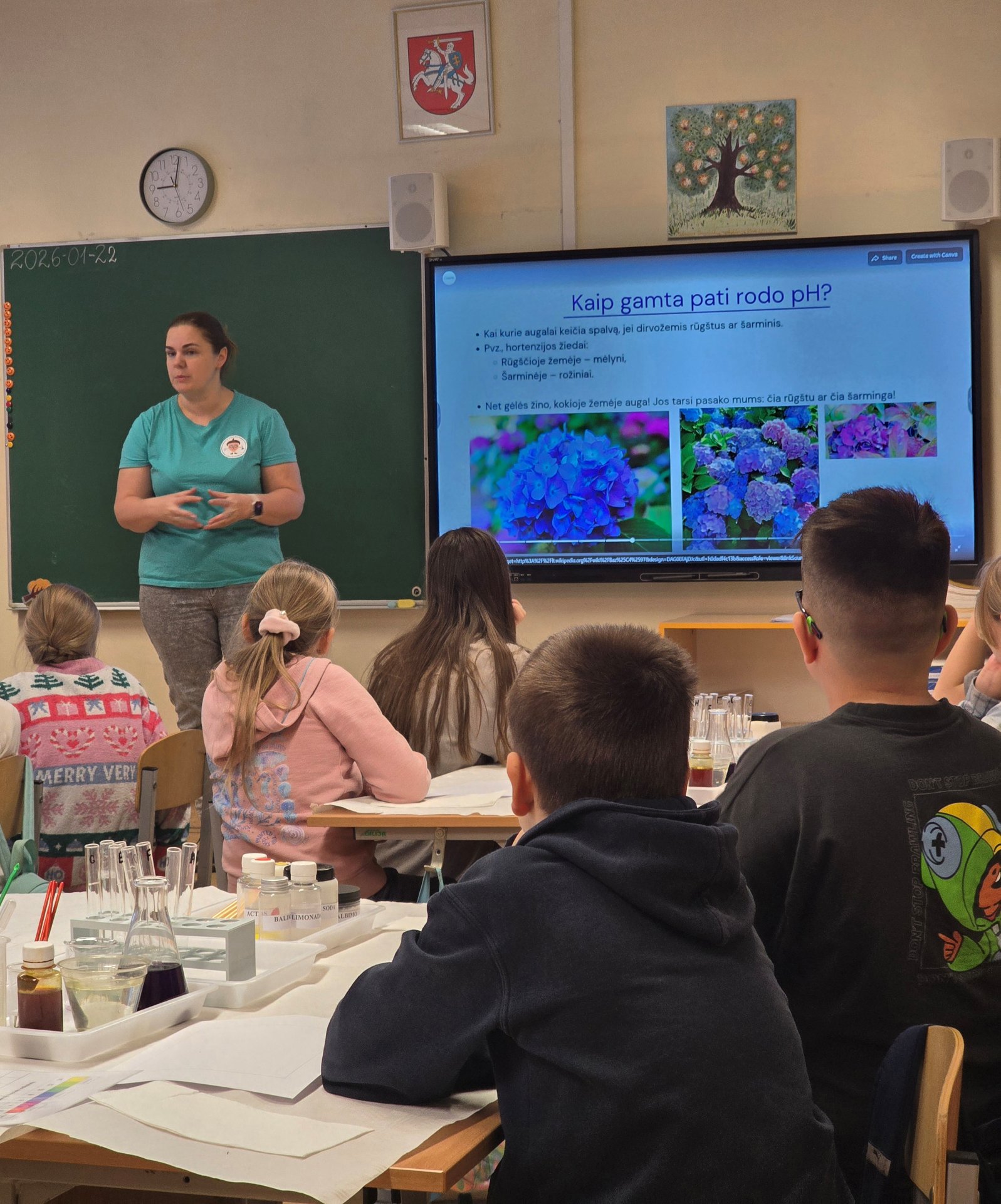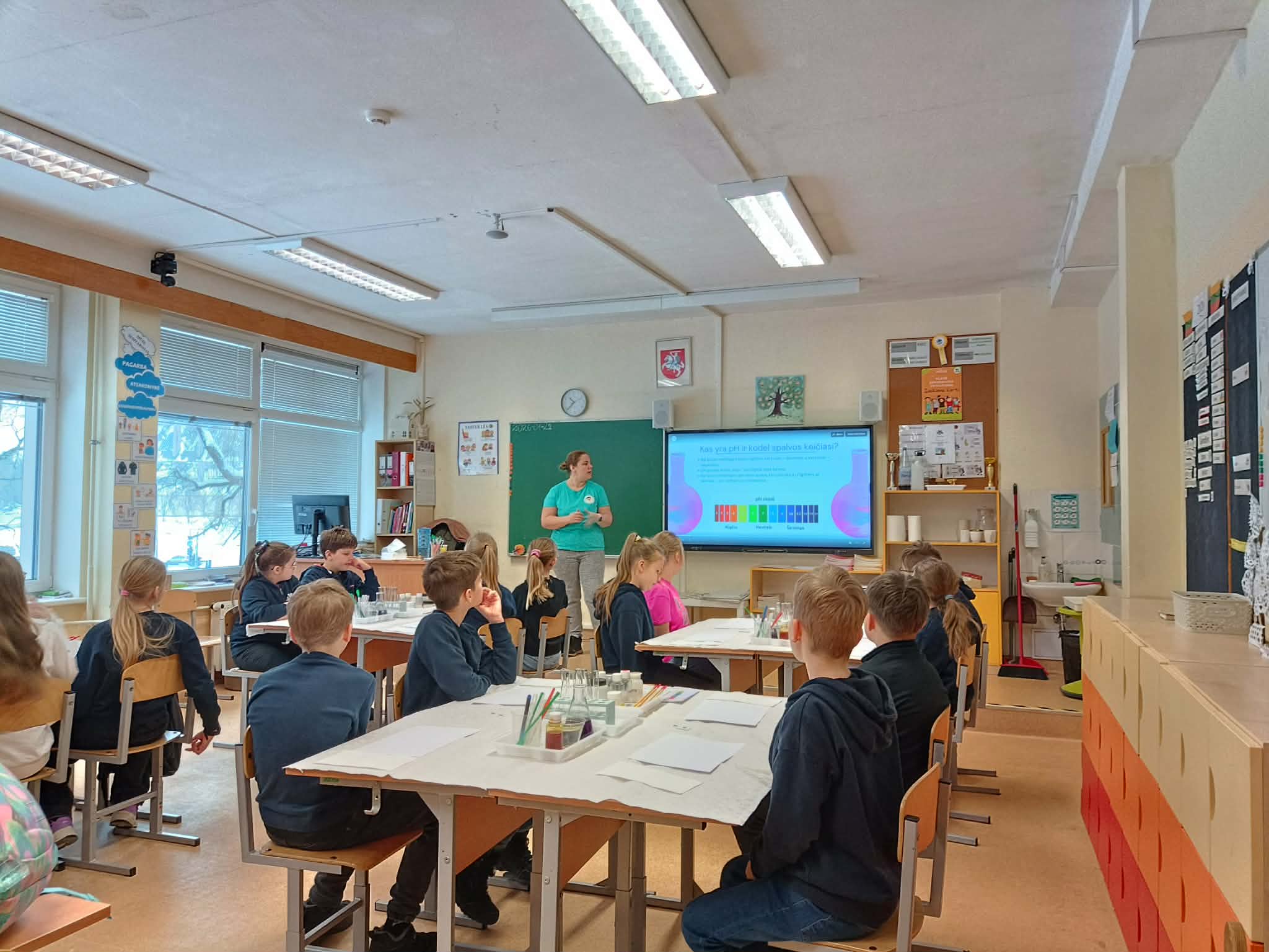 Didžiausią įspūdį mokiniams paliko praktiniai bandymai – lašindami skirtingus skysčius į indikatorius, vaikai stebėjo, kaip gimsta raudona, mėlyna, žalia ar geltona spalvos. Spalvų virsmas kėlė nuostabą, džiaugsmą ir skatino pažinimo džiaugsmą.