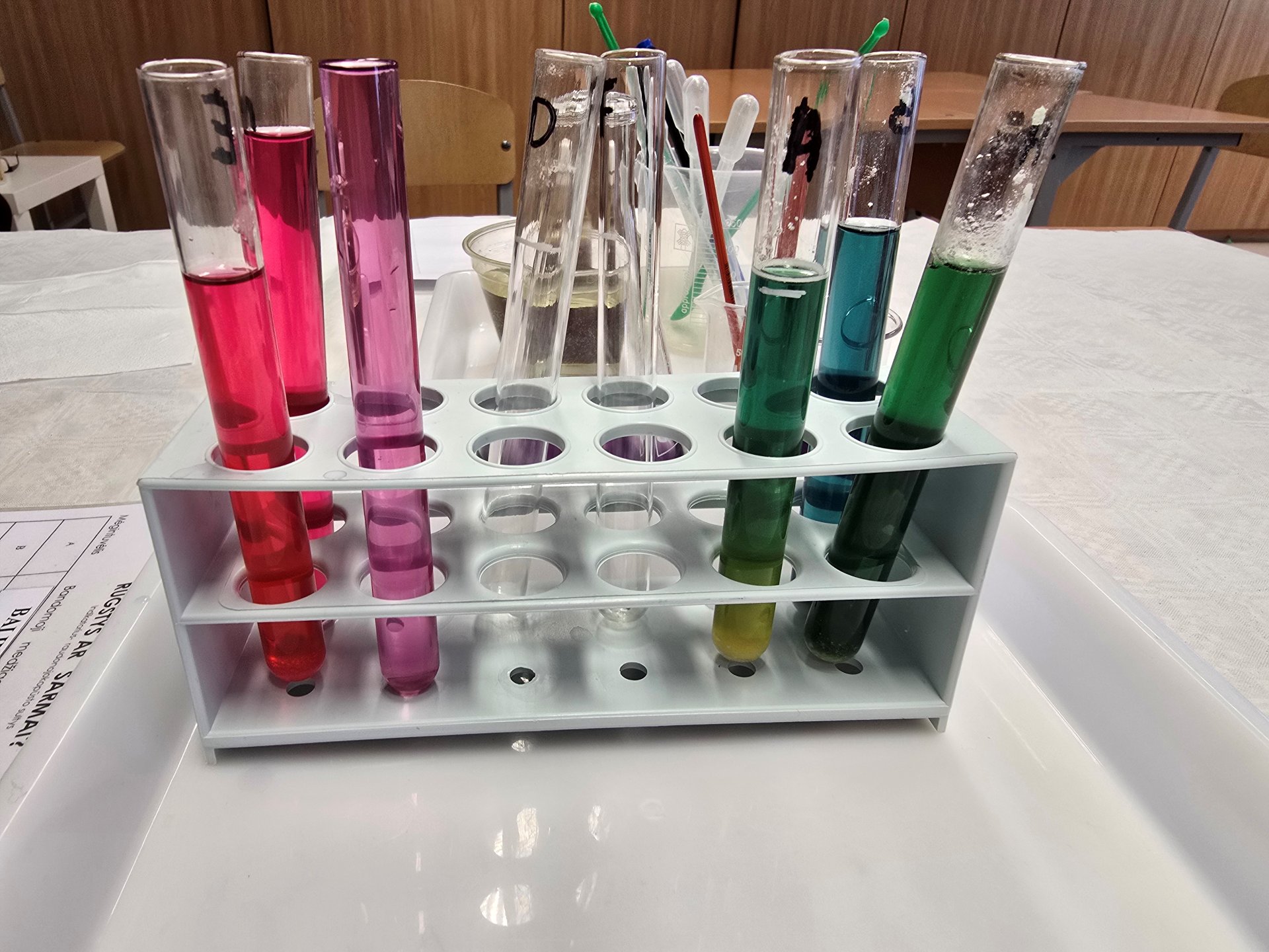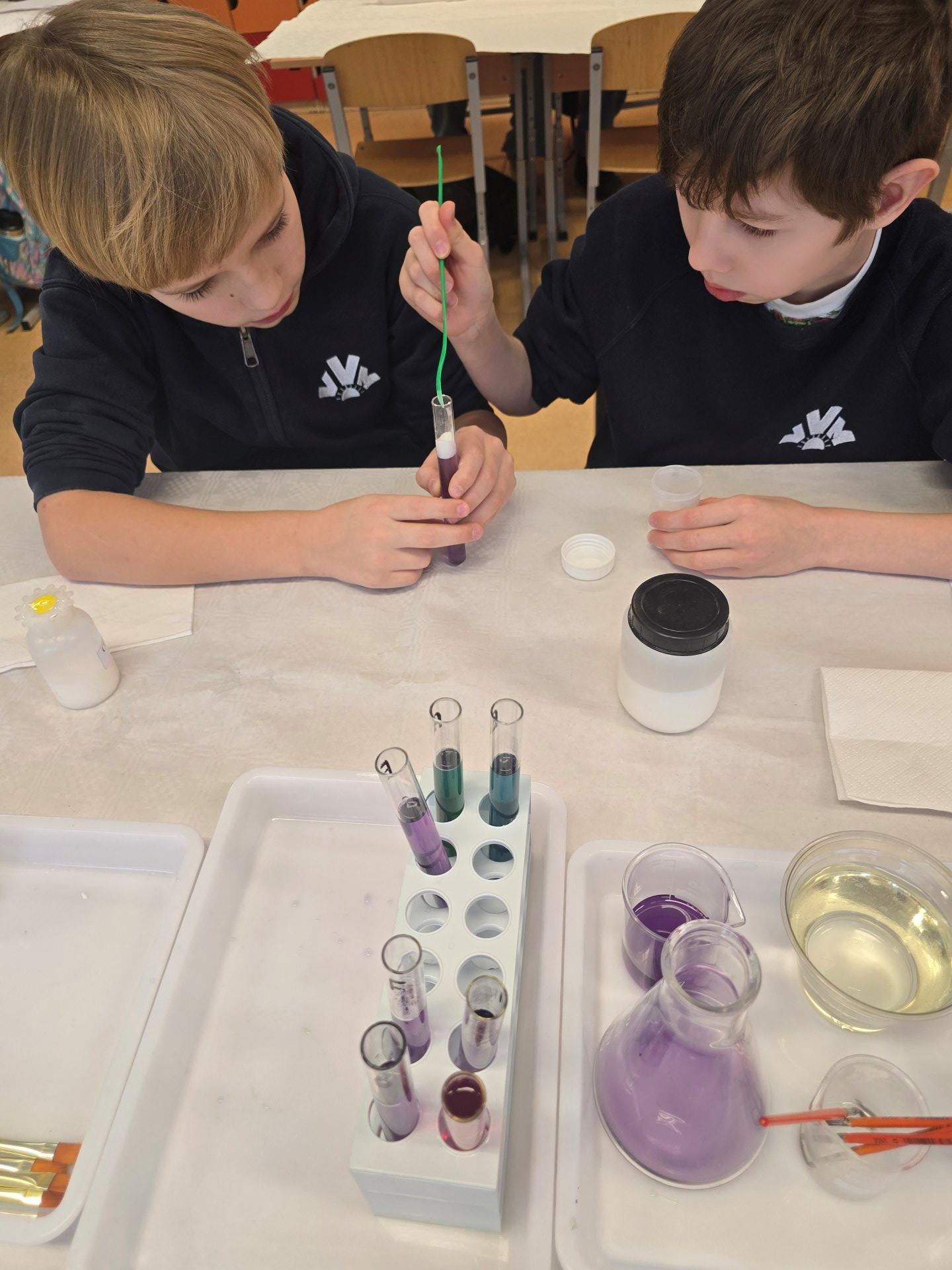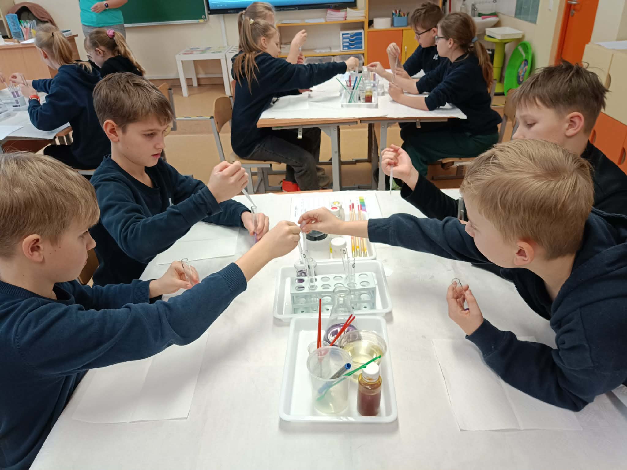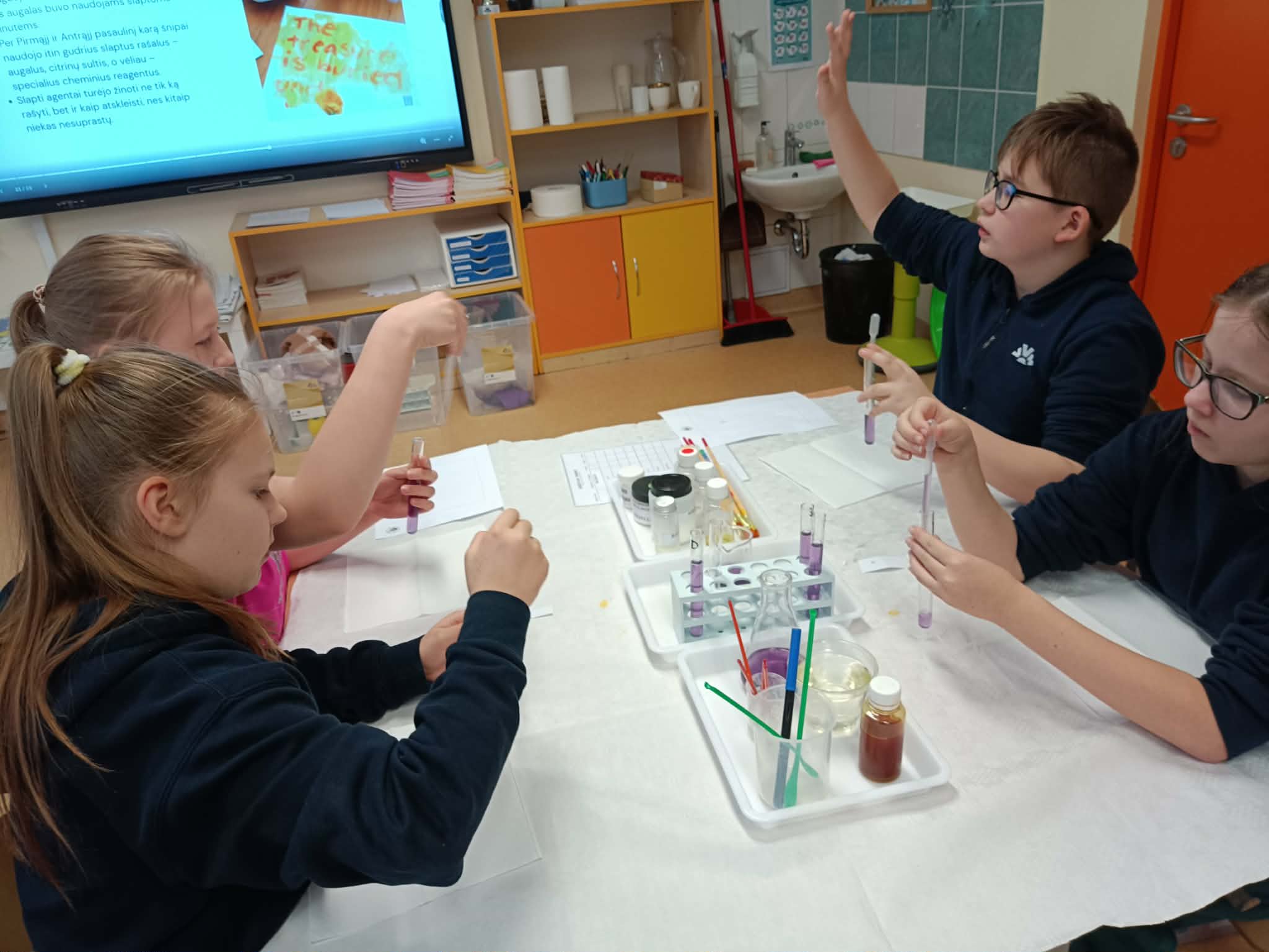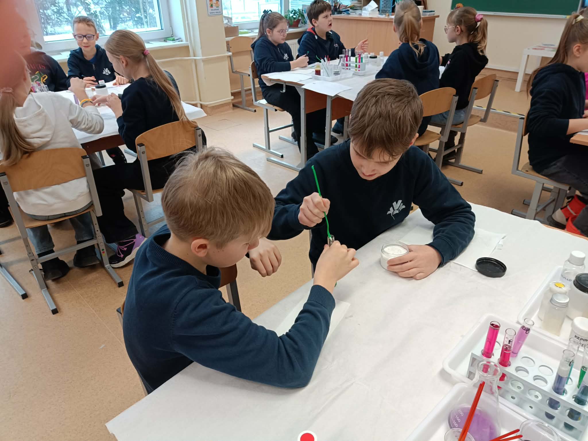 Užsiėmimo metu mokiniai tapo mažaisiais mokslininkais – jie susipažino su laboratorinėmis priemonėmis: pipetėmis, indeliais, skysčiais, mokėsi saugiai ir atsakingai eksperimentuoti. Edukacijos pradžioje vaikai tyrinėjo natūralius cheminius indikatorius – raudonojo kopūsto sultis ir mėlynosios balnapupės arbatą. Edukatorė paaiškino, kaip šios medžiagos reaguoja su rūgštimis ir šarmais, kodėl keičia spalvą ir kaip spalvos gali „pasakoti“ apie chemines savybes.