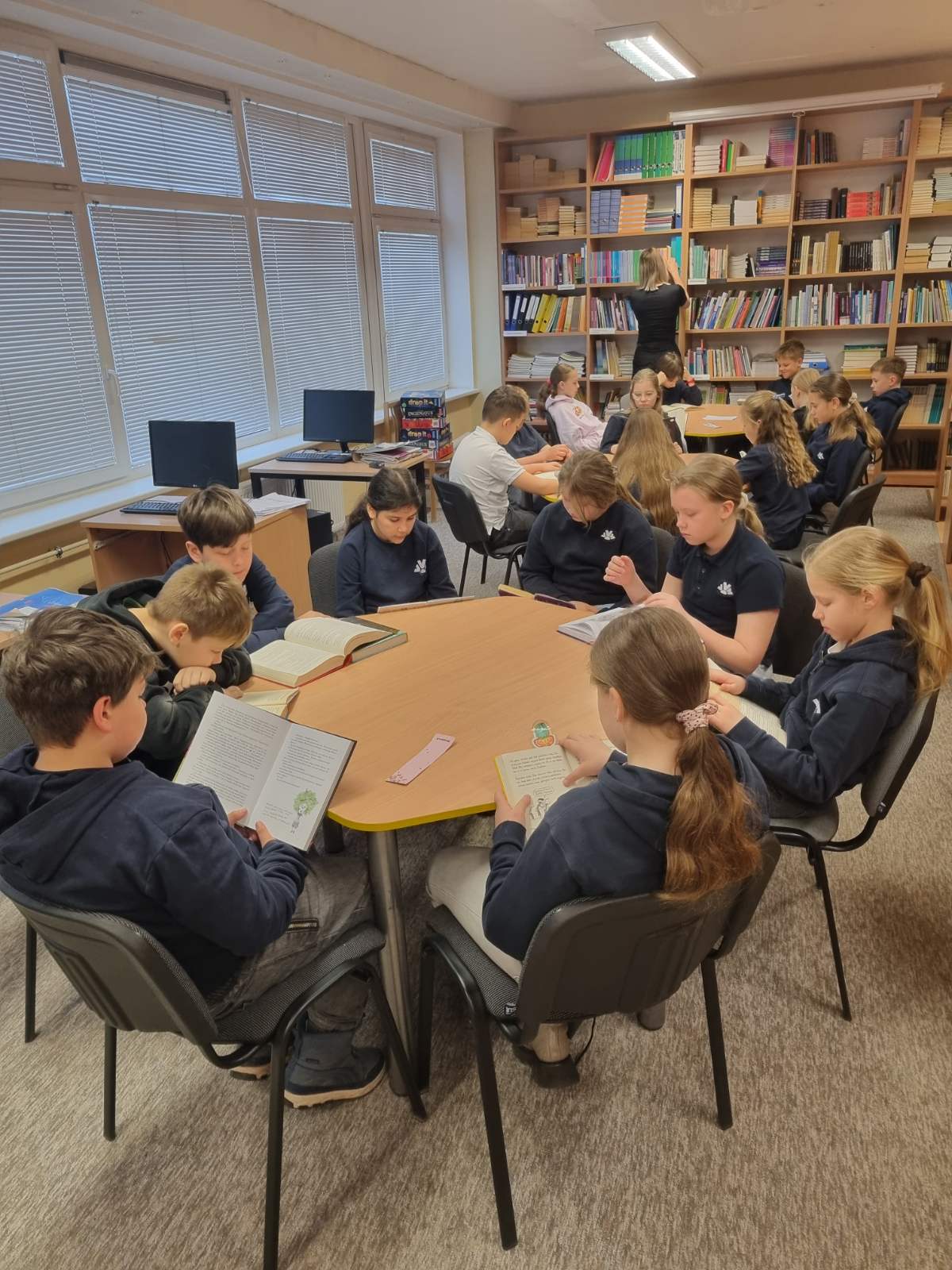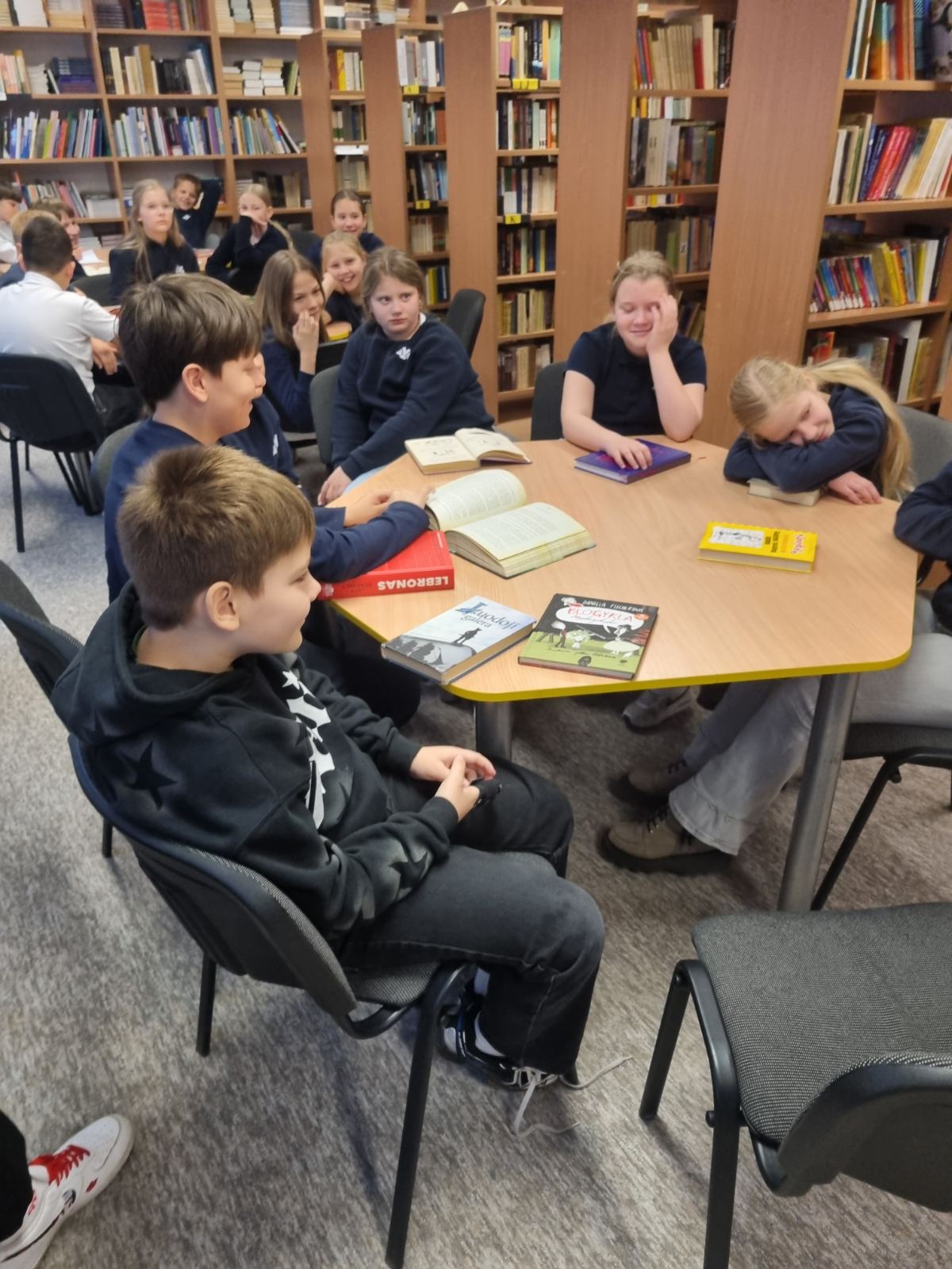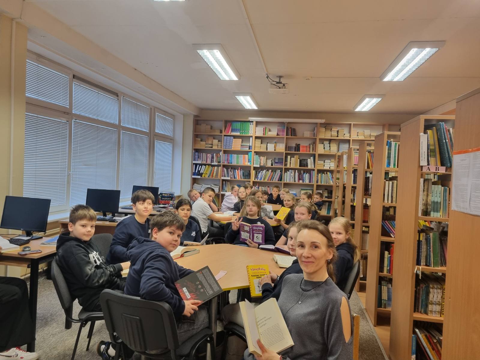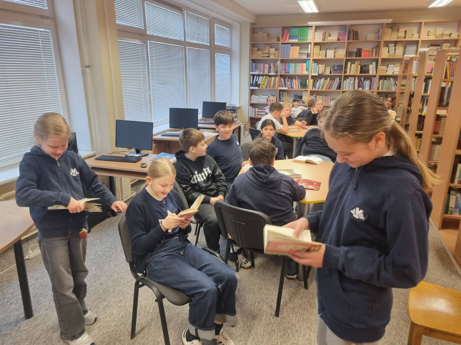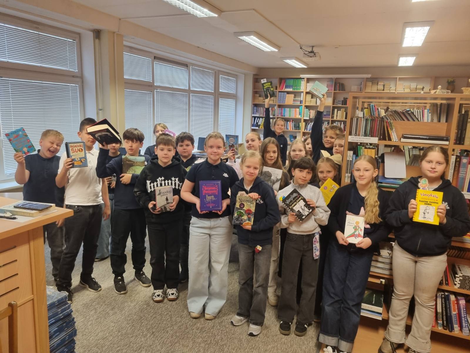 4B klasės mokiniai paminėjo tarptautinę knygos dieną. Nukeliavome į mokyklos biblioteką. Ten visi drauge skaitėme savo mėgstamas knygas. Dalis mokinių pakomentavo, kodėl draugams siūlo perkaityti vieną ar kitą knygą. Po to mokiniai pasiskirstę vaidmenimis suvaidino keletą ištraukų iš knygos.