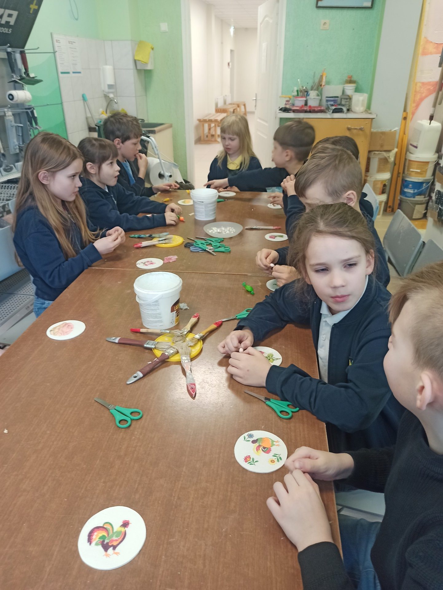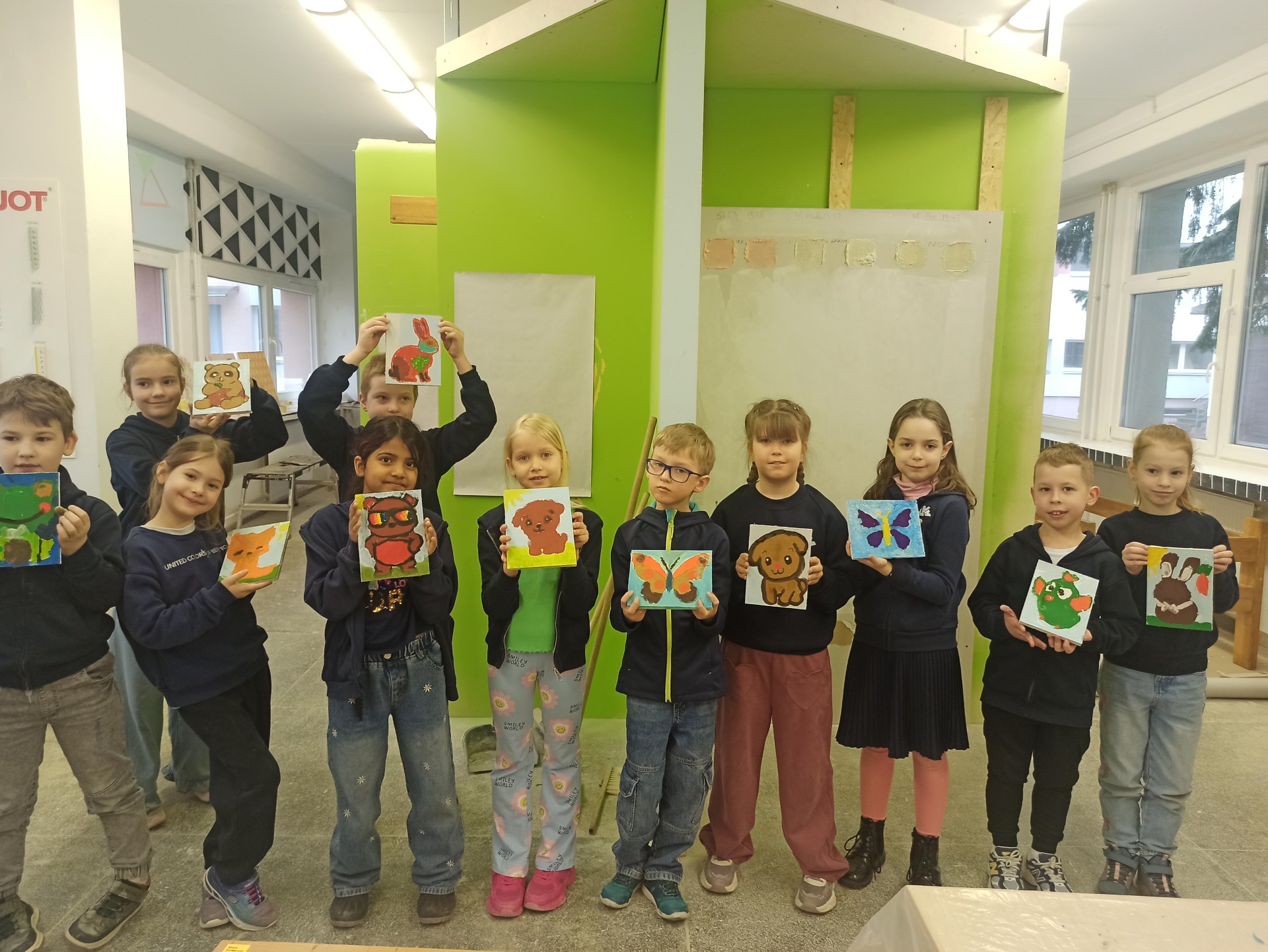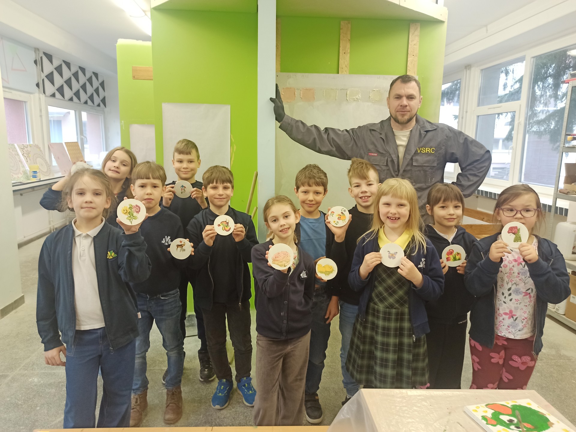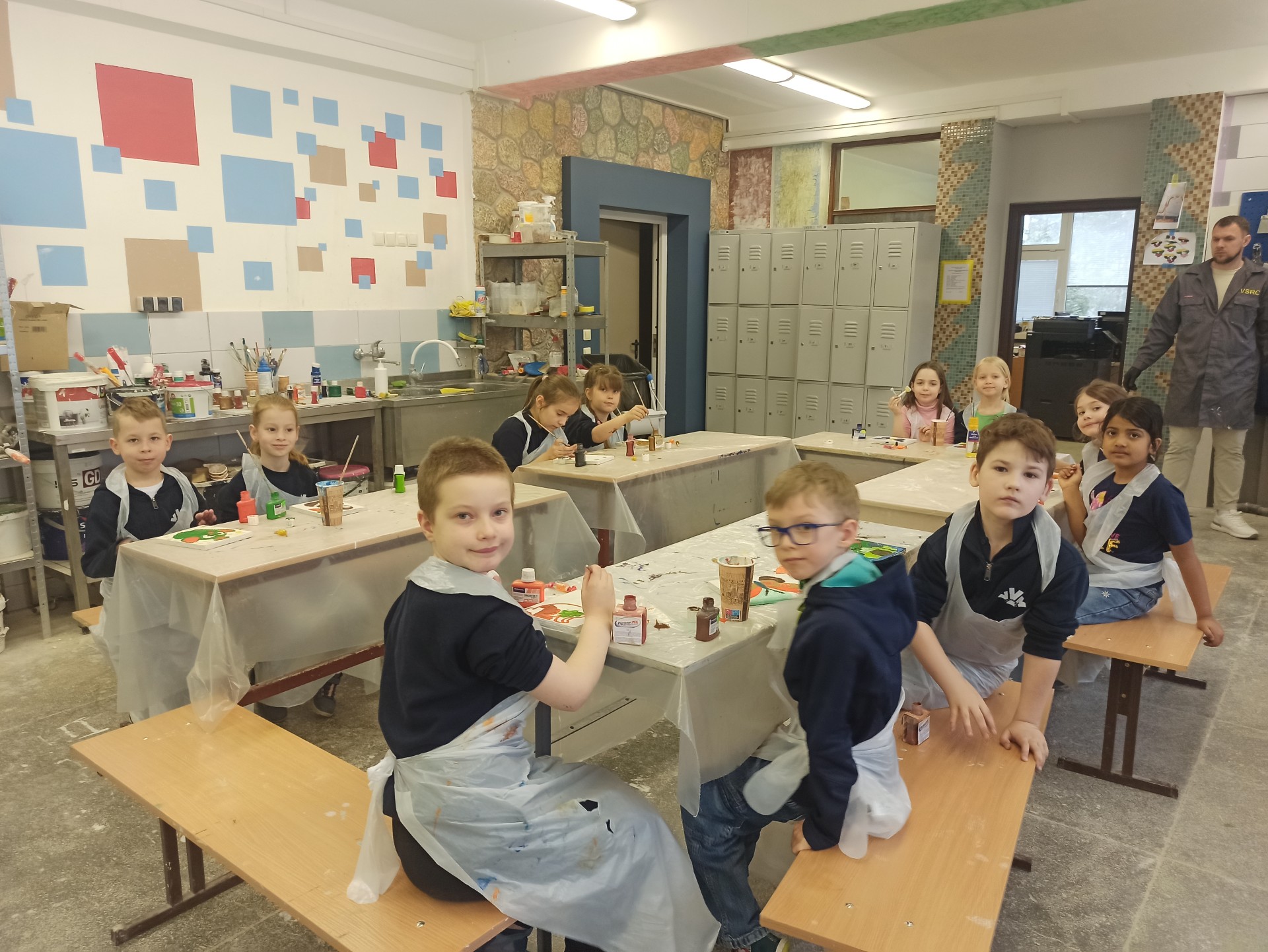 1B klasės mokiniams dailės ir technologijų pamokos vyko Vilniaus statybininkų rengimo centre. Mokiniai buvo suskirstyti į dvi grupes. Vieni mokiniai aliejiniais dažais piešė įvairius žvėrelius, kiti mokiniai, naudodamiesi dekupažo technika, gamino padėkliukus. Ši veikla ugdo kūrybiškumą ir meninius gebėjimus.